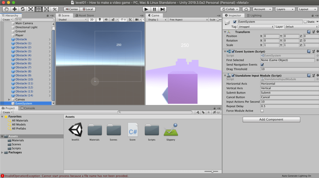 This week I created a quick prototype for a one button game. I wanted to create a 3D flappy bird-like game. I decided to use last week’s Breckey’s tutorial and try to experiment for this version. It went pretty well! You have probably already seen the picture below and read the title, but bear with me! I was able to change the code to jumping without the help of another tutorial and there’s an improvement in the aesthetics as well. Now, as can be seen in the picture below I struggled with… whatever you call this. Every time I triet to test run my game in Unity this would happen. I think it might have something to do with the RAM of my Macbook. When I hit build and run, the game suddendly worked perfectly fine, so as far as I know, it wasn’t actually anything I did…